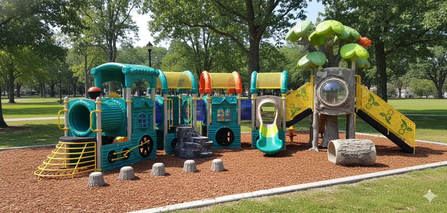 Module de jeu Locomotive et Wagons : Long parcours d’aventure idéal pour le jeu de rôle coopératif et le voyage. L’embarquement (escalade, échelles) mène à la traversée des wagons (passerelles d’équilibre). Sortie rapide par glissades. Favorise le jeu social et la coordination. (accessoires au sol vendu séparément)