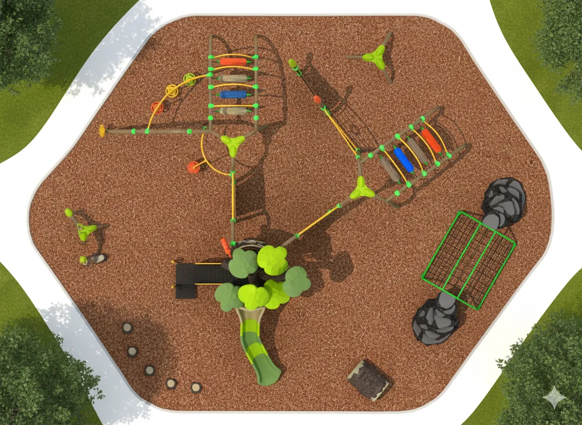 Parcours d’Agilité et d’Escalade : Structure ouverte et variée (cordes, filets) conçue pour se surpasser. L’ascension est centrale, complétée par des défis d’équilibre et des glissades rapides. Met l’accent sur la force, la motricité et la résolution de problèmes. (accessoires au sol vendu séparément)