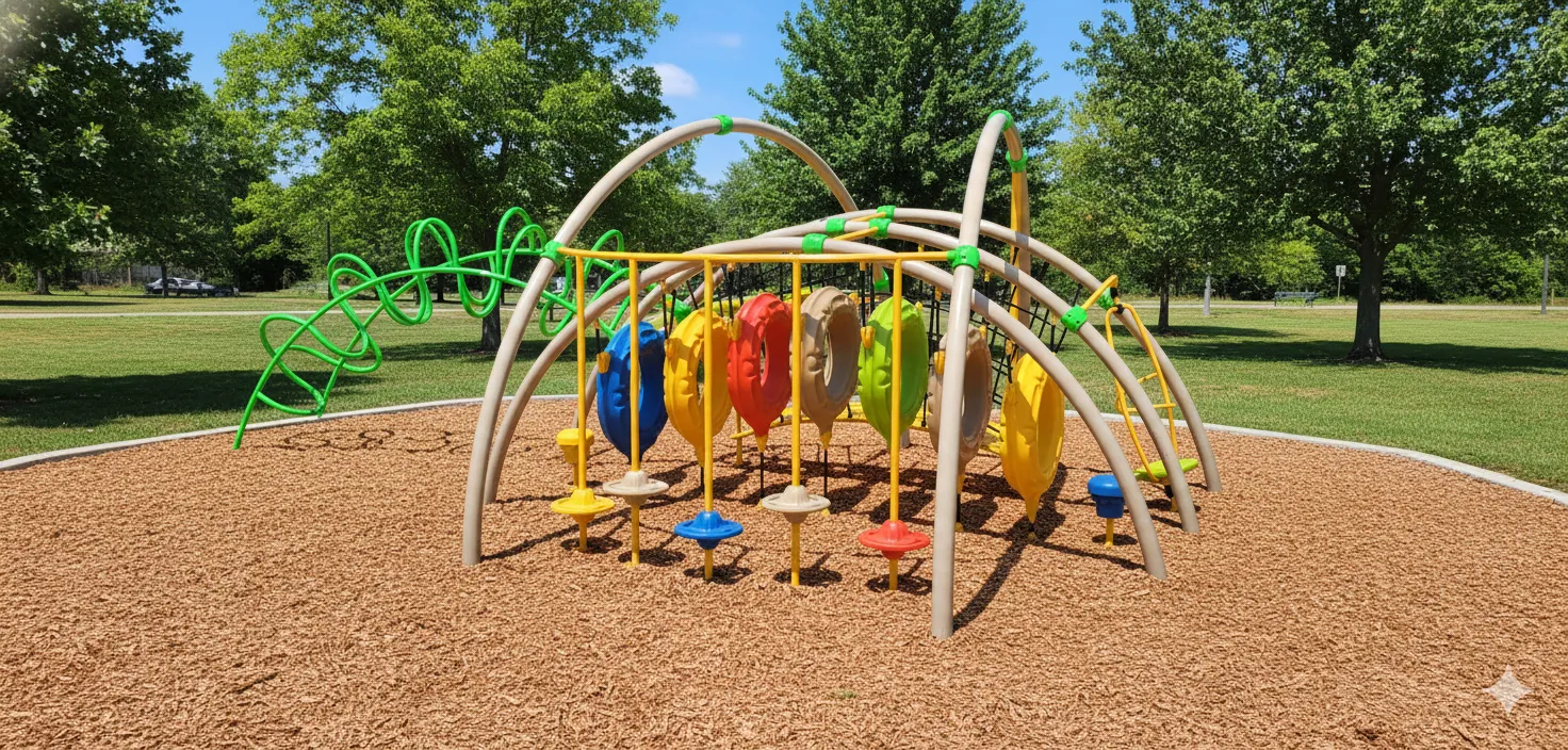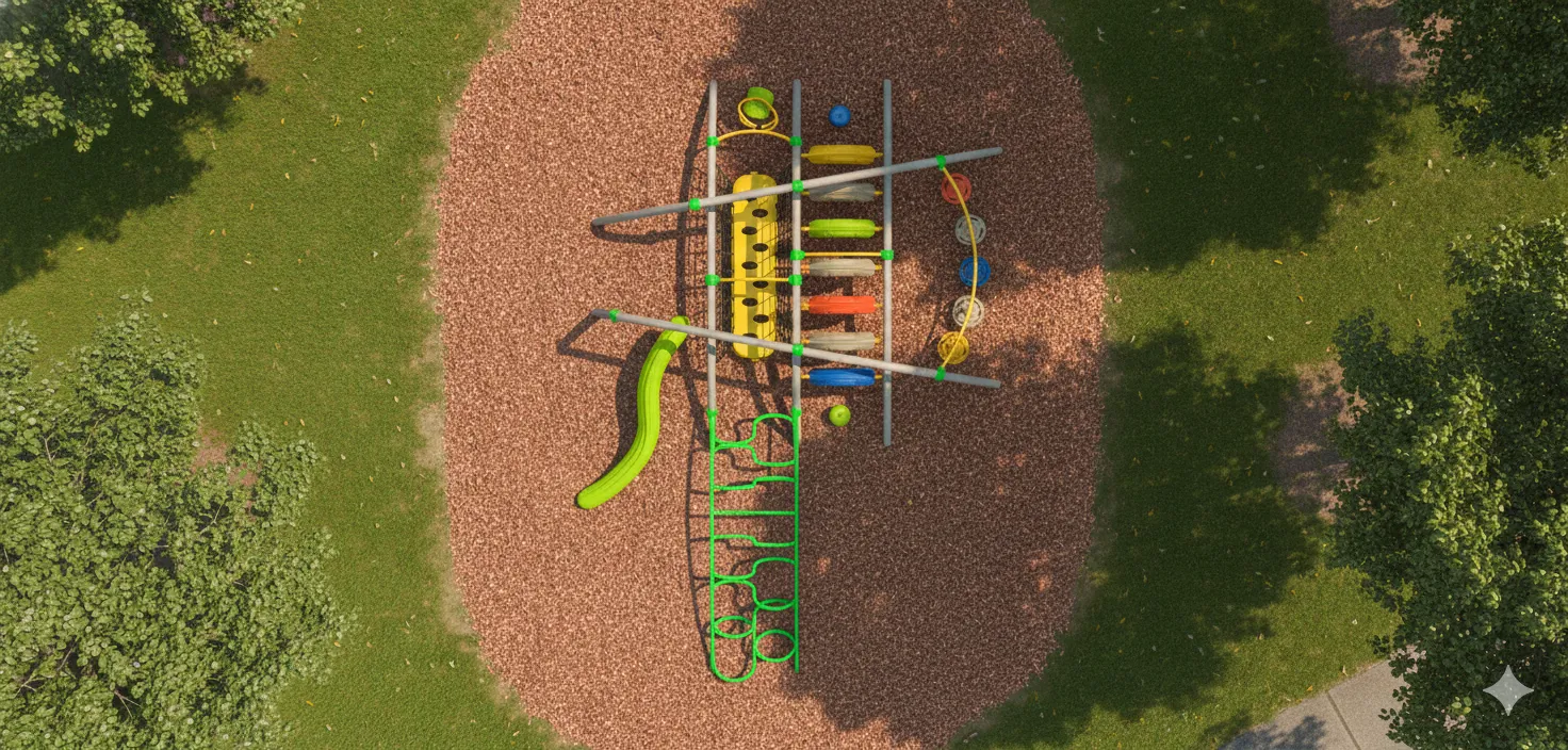 Parcours d’Agilité et d’Escalade : Structure ouverte et variée (cordes, filets) conçue pour se surpasser. L’ascension est centrale, complétée par des défis d’équilibre et des glissades rapides. Met l’accent sur la force, la motricité et la résolution de problèmes. (accessoires au sol vendu séparément)