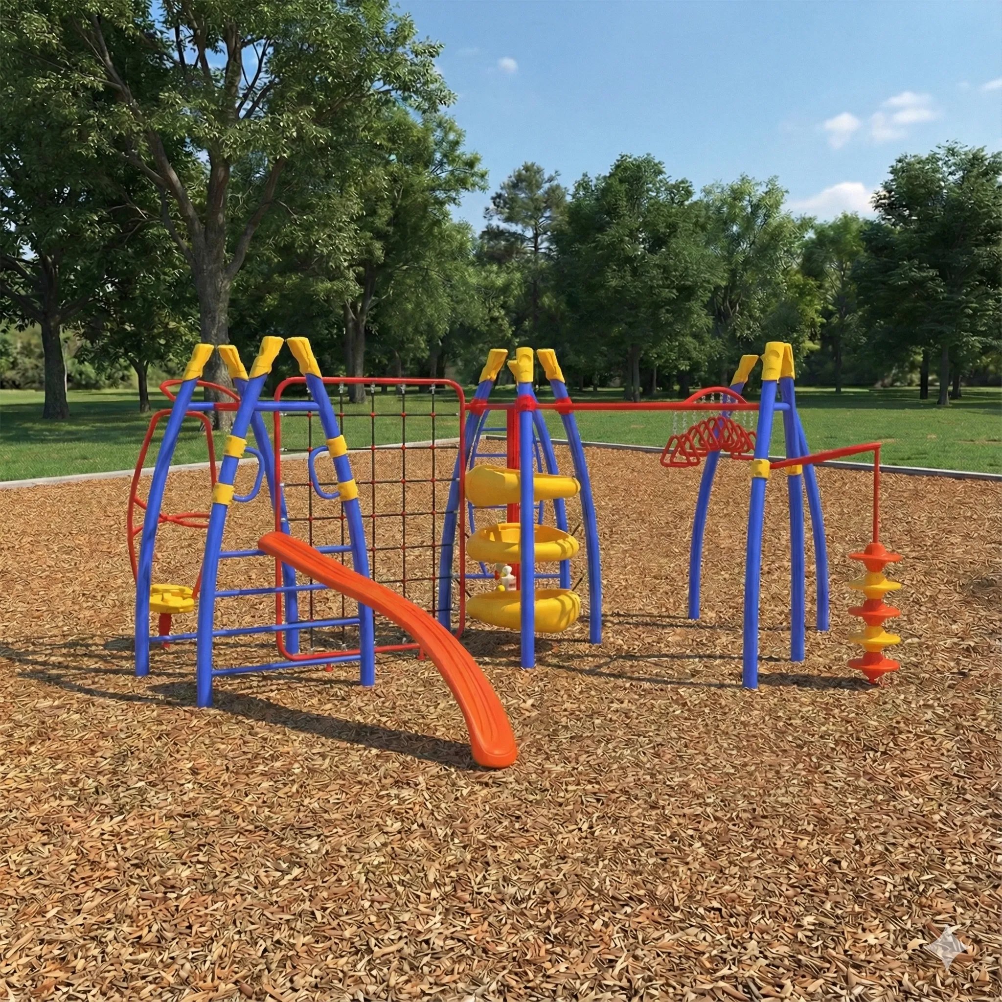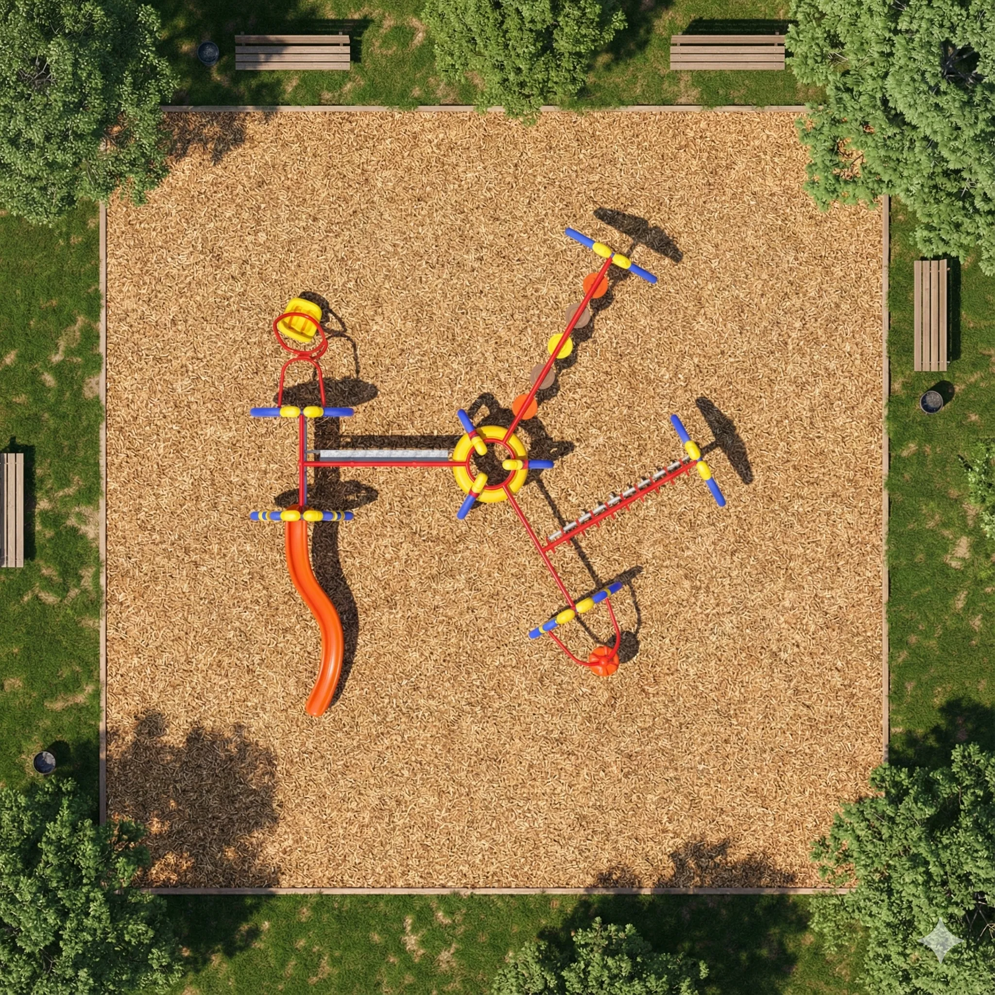 Parcours d’Agilité et d’Escalade : Structure ouverte et variée (cordes, filets) conçue pour se surpasser. L’ascension est centrale, complétée par des défis d’équilibre et des glissades rapides. Met l’accent sur la force, la motricité et la résolution de problèmes. (accessoires au sol vendu séparément)
