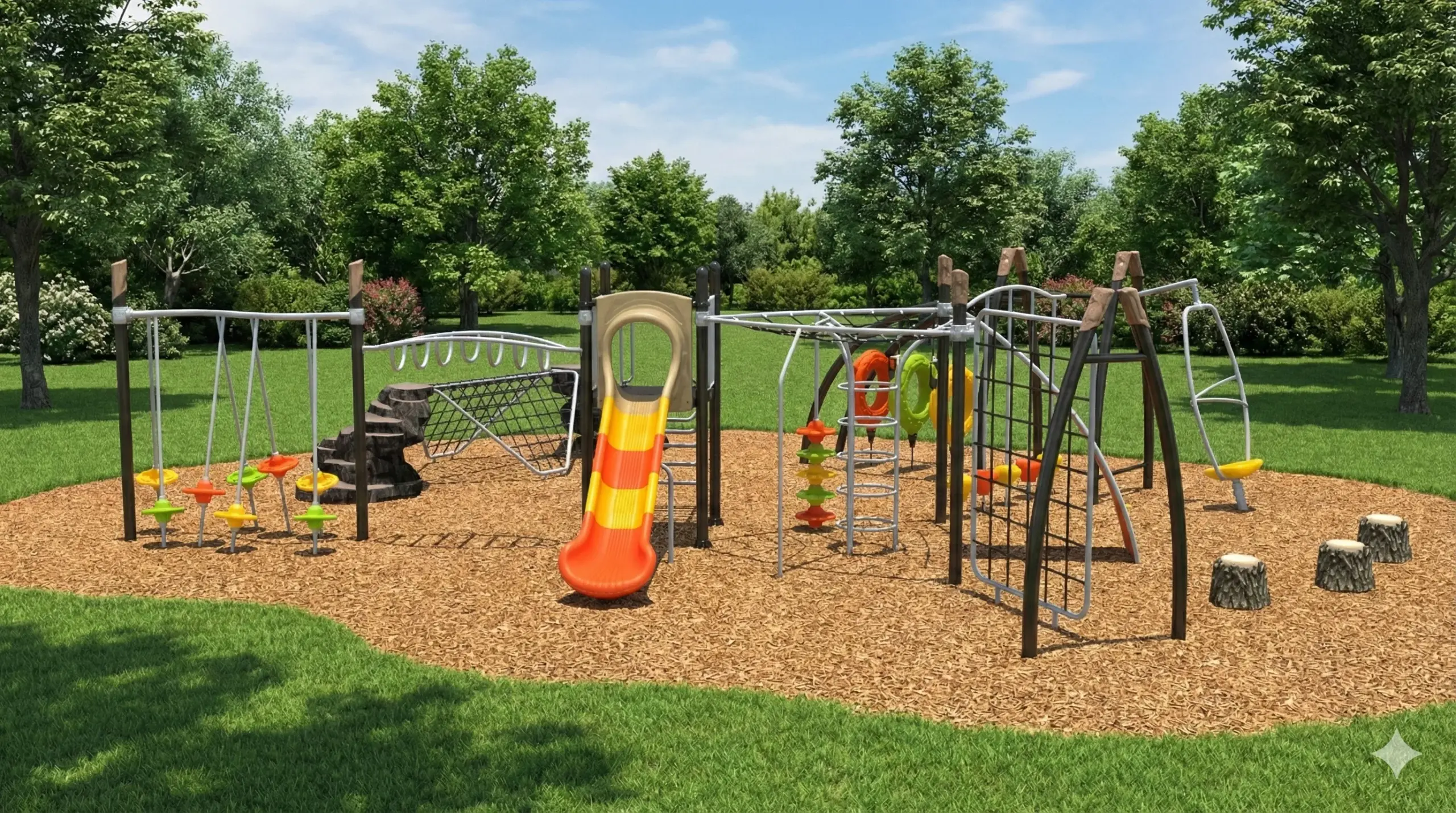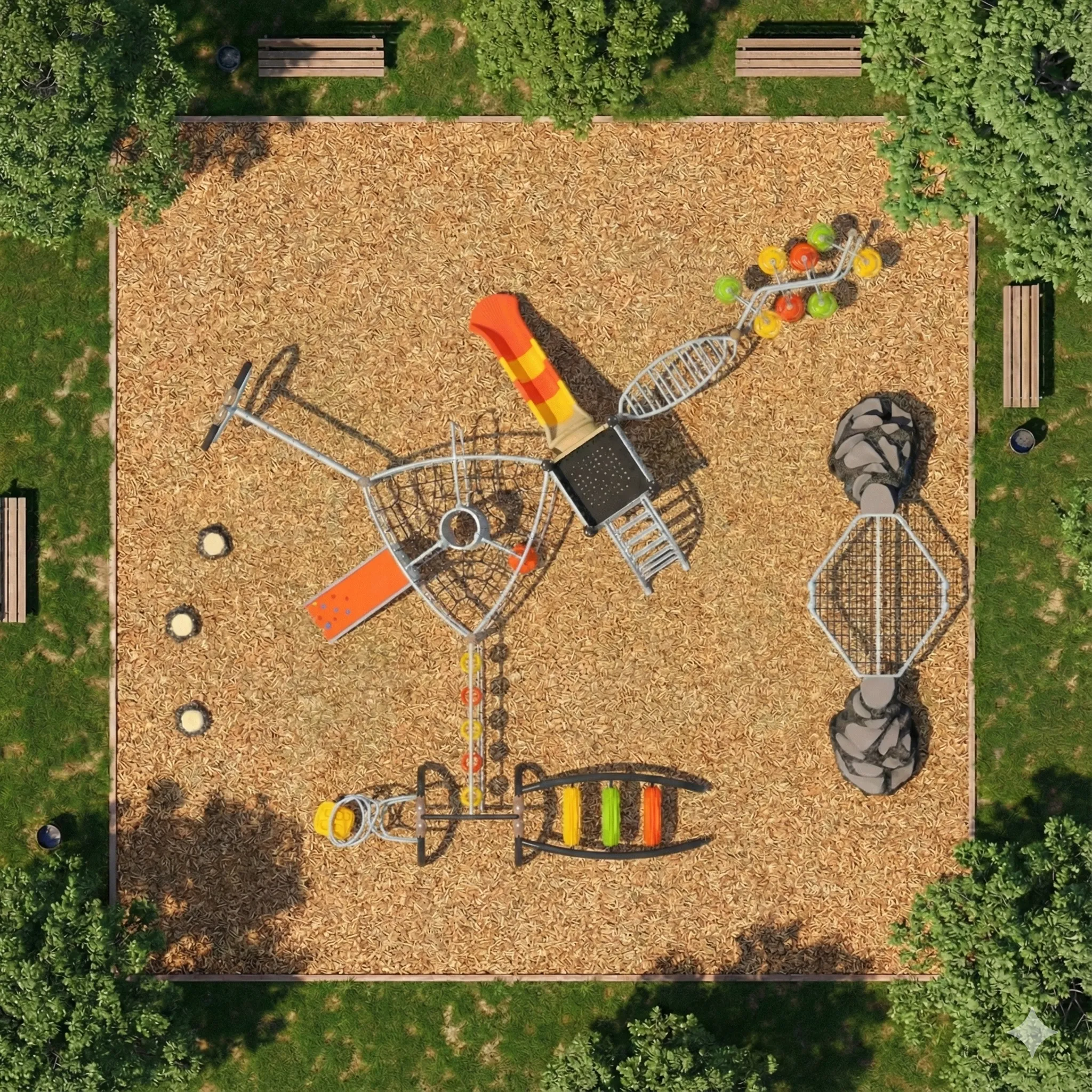 Parcours d’Agilité et d’Escalade : Structure ouverte et variée (cordes, filets) conçue pour se surpasser. L’ascension est centrale, complétée par des défis d’équilibre et des glissades rapides. Met l’accent sur la force, la motricité et la résolution de problèmes. (accessoires au sol vendu séparément)