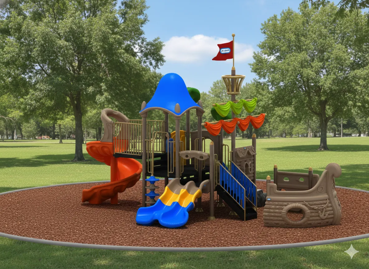 Ce module de jeu extérieur est une structure impressionnante en forme de bateau pirate, promettant des heures d’aventures palpitantes. Les jeunes explorateurs peuvent se lancer à l’assaut du pont en empruntant les échelles et les différents modules d’escalade , développant ainsi leur agilité. Pour une descente rapide vers l’eau (imaginaire!), une ou plusieurs glissades offrent une échappatoire ludique. Des poutres ou points à traverser ajoutent des défis d’équilibre, permettant de se prendre pour un véritable flibustier marchant sur la planche. C’est l’endroit idéal pour laisser libre cours à l’imagination et partir à la recherche de trésors cachés ! (accessoires au sol vendu séparément)