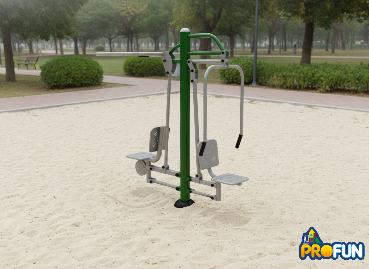 Cet appareil est un poste de musculation extérieur à deux stations distinctes pour le haut du corps, une station dédiée au renforcement des muscles du dos, des épaules et des bras. Conçu pour être utilisé par deux et l’autre cible la poitrine et les épaules, il est conçu pour êre utilisé par deux personnes simultanément, il utilise le poids du corps comme résistance pour un entraînement fluide et accessible à tous les niveaux de condition physique.
