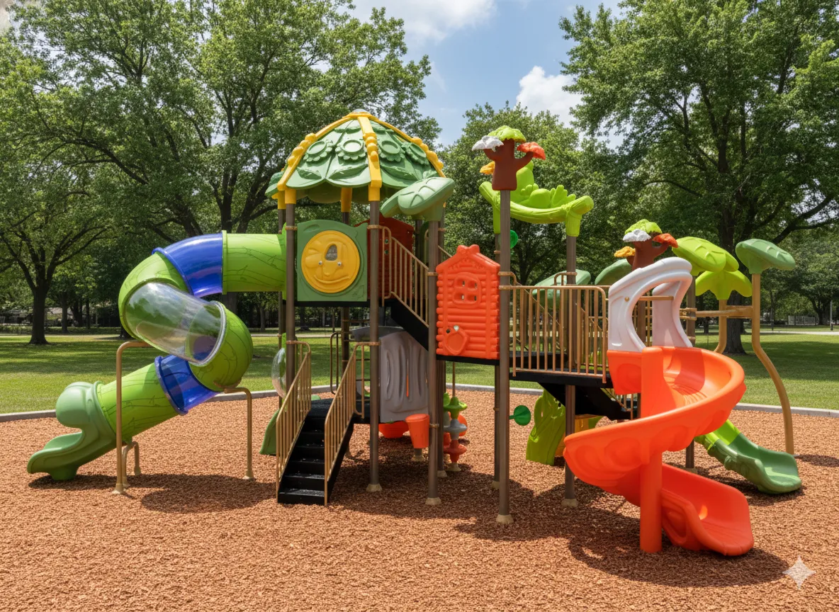 Parcours d’obstacles Jungle : Module immersif simulant la forêt tropicale. Les enfants grimpent à travers la canopée (filets, murs), testent leur agilité sur des points suspendus, et s’échappent par une glissade rapide. Idéal pour renforcer la motricité globale et les jeux de rôle. (accessoires au sol vendu séparément)
