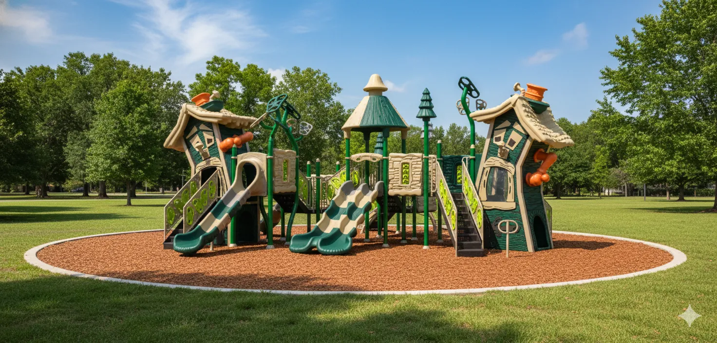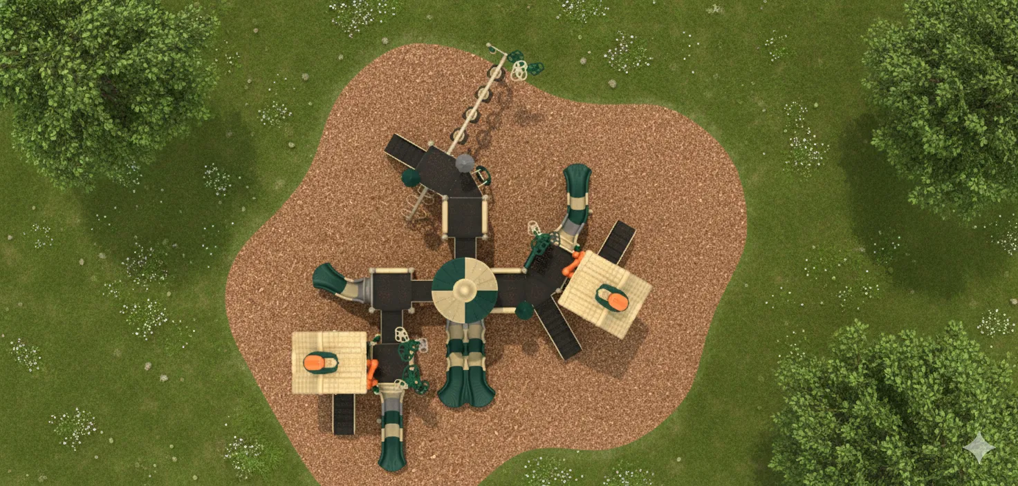 Ce module de jeu est un ensemble de structures aux formes décalées et aux angles volontairement inclinés, créant un environnement ludique qui défie la perception et l’équilibre des enfants. L’expérience commence par des échelles et des modules d’escalade pour monter vers la “maison tordue”, donnant l’impression de se trouver dans un monde de dessin animé. Les défis d’équilibre sont omniprésents : points, poutres et passerelles. Pour redescendre de ce village excentrique, des glissades offrent une descente rapide et amusante.
