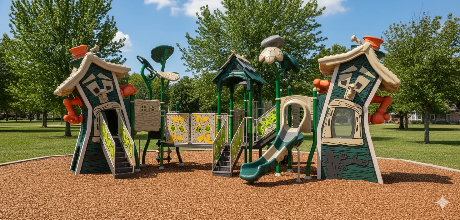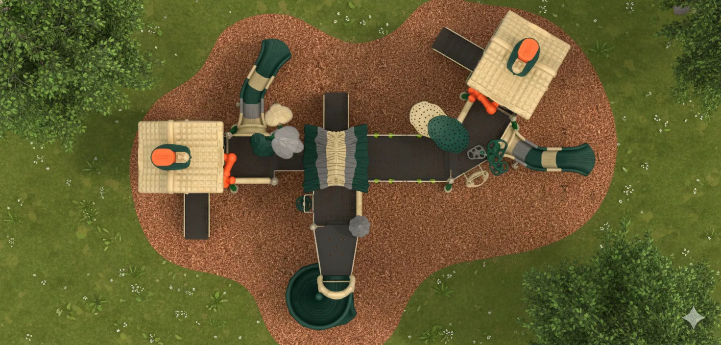 Ce module de jeu est un ensemble de structures aux formes décalées et aux angles volontairement inclinés, créant un environnement ludique qui défie la perception et l’équilibre des enfants. L’expérience commence par des échelles et des modules d’escalade pour monter vers la “maison tordue”, donnant l’impression de se trouver dans un monde de dessin animé. Les défis d’équilibre sont omniprésents : points, poutres et passerelles. Pour redescendre de ce village excentrique, des glissades offrent une descente rapide et amusante.