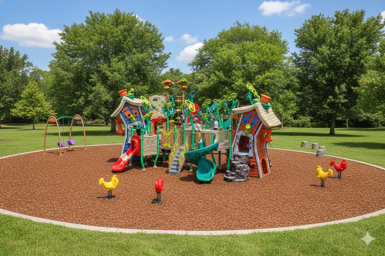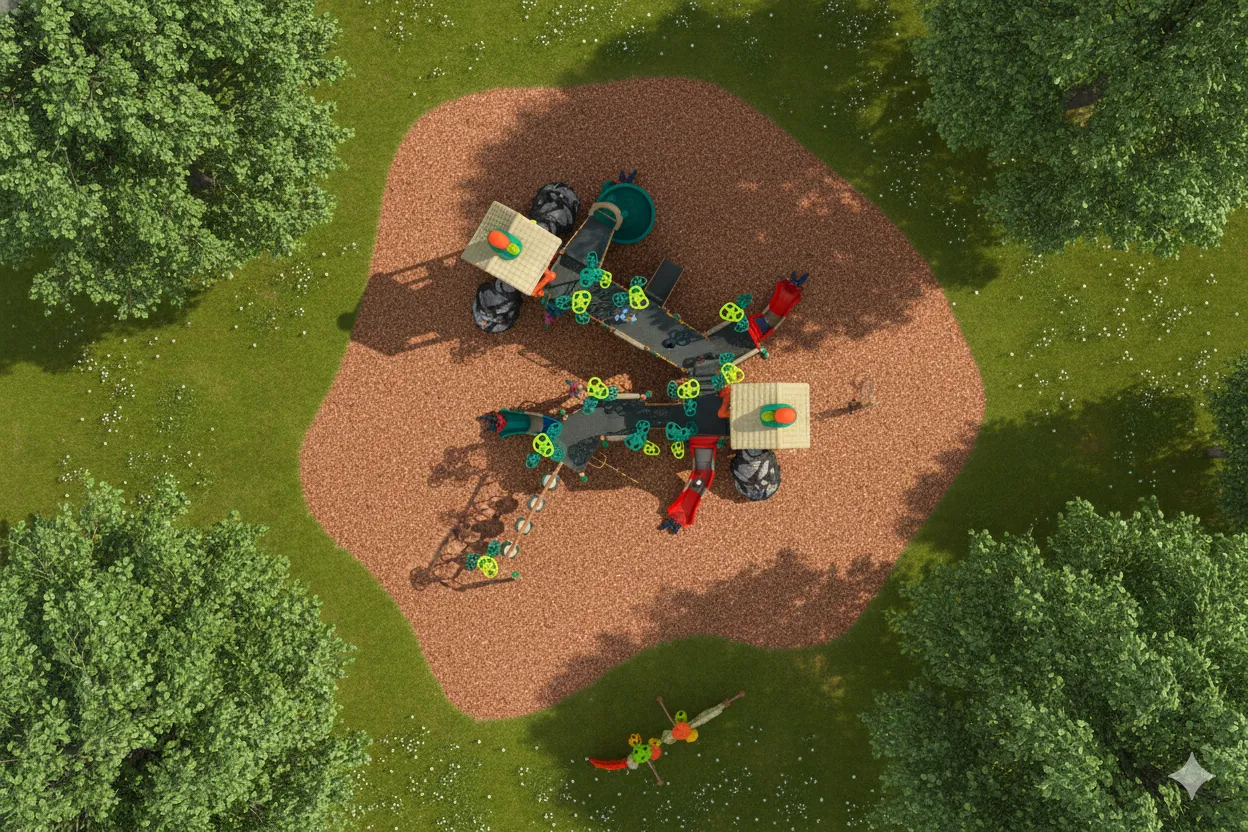 Ce module de jeu est un ensemble de structures aux formes décalées et aux angles volontairement inclinés, créant un environnement ludique qui défie la perception et l’équilibre des enfants. L’expérience commence par des échelles et des modules d’escalade pour monter vers la “maison tordue”, donnant l’impression de se trouver dans un monde de dessin animé. Les défis d’équilibre sont omniprésents : points, poutres et passerelles. Pour redescendre de ce village excentrique, des glissades offrent une descente rapide et amusante.