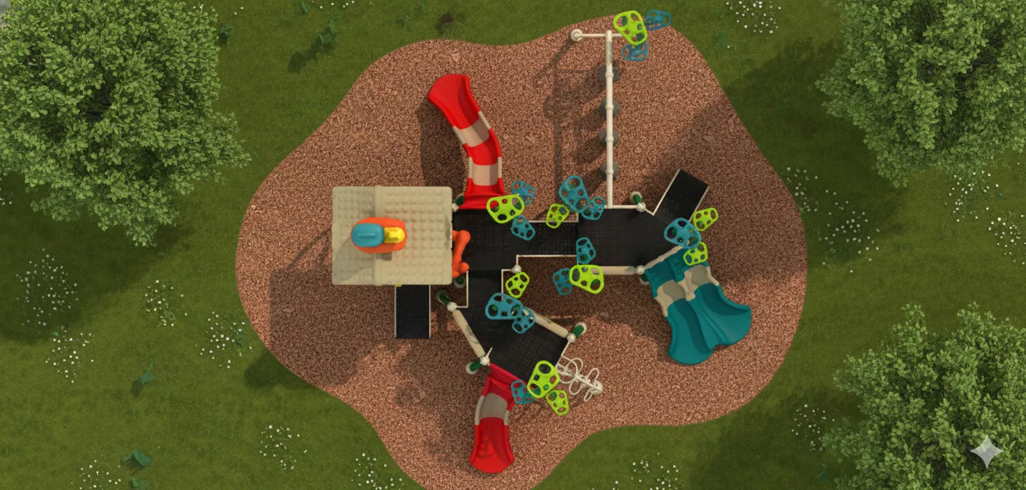 Ce module de jeu est un ensemble de structures aux formes décalées et aux angles volontairement inclinés, créant un environnement ludique qui défie la perception et l’équilibre des enfants. L’expérience commence par des échelles et des modules d’escalade pour monter vers la “maison tordue”, donnant l’impression de se trouver dans un monde de dessin animé. Les défis d’équilibre sont omniprésents : points, poutres et passerelles. Pour redescendre de ce village excentrique, des glissades offrent une descente rapide et amusante.