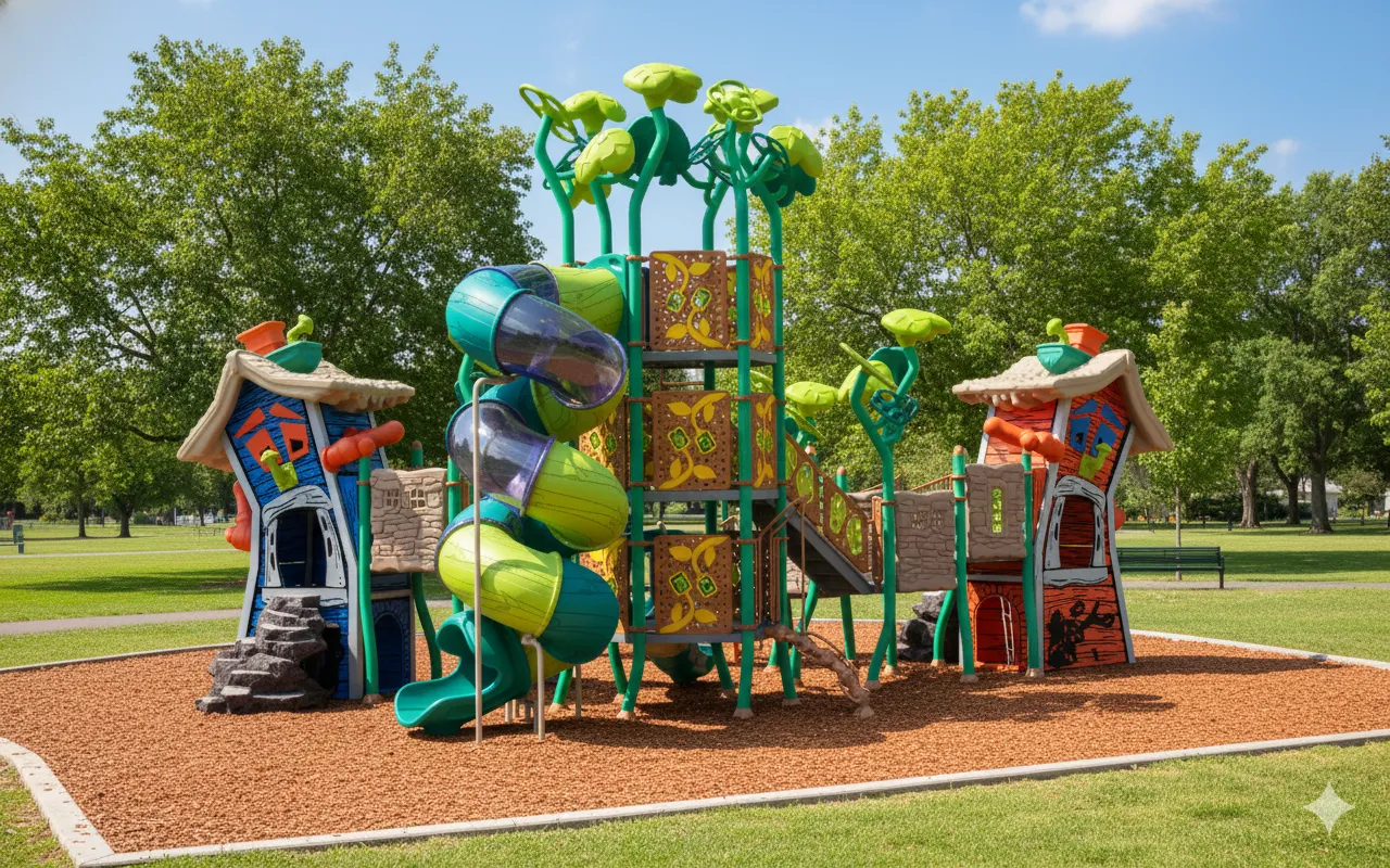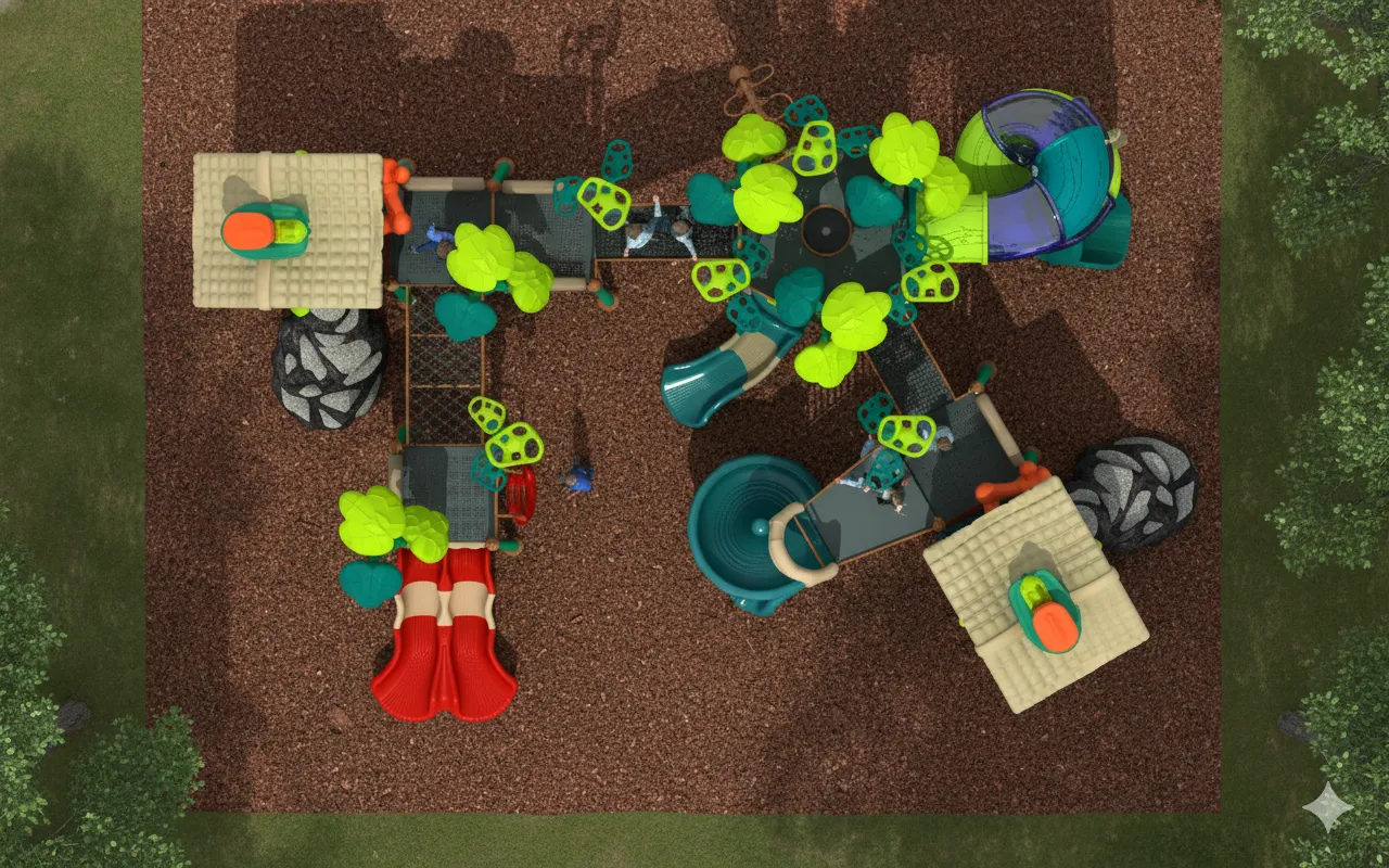 Ce module de jeu est un ensemble de structures aux formes décalées et aux angles volontairement inclinés, créant un environnement ludique qui défie la perception et l’équilibre des enfants. L’expérience commence par des échelles et des modules d’escalade pour monter vers la “maison tordue”, donnant l’impression de se trouver dans un monde de dessin animé. Les défis d’équilibre sont omniprésents : points, poutres et passerelles. Pour redescendre de ce village excentrique, des glissades offrent une descente rapide et amusante.