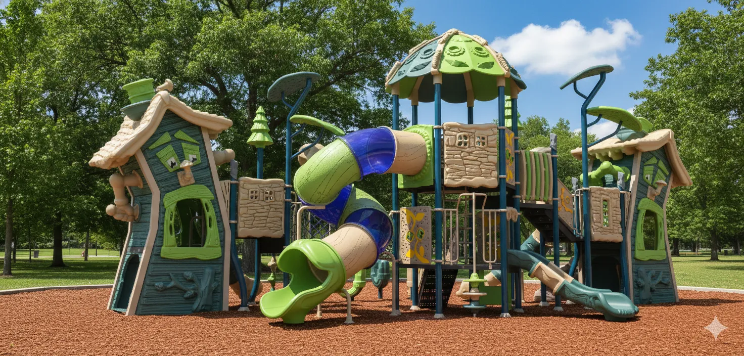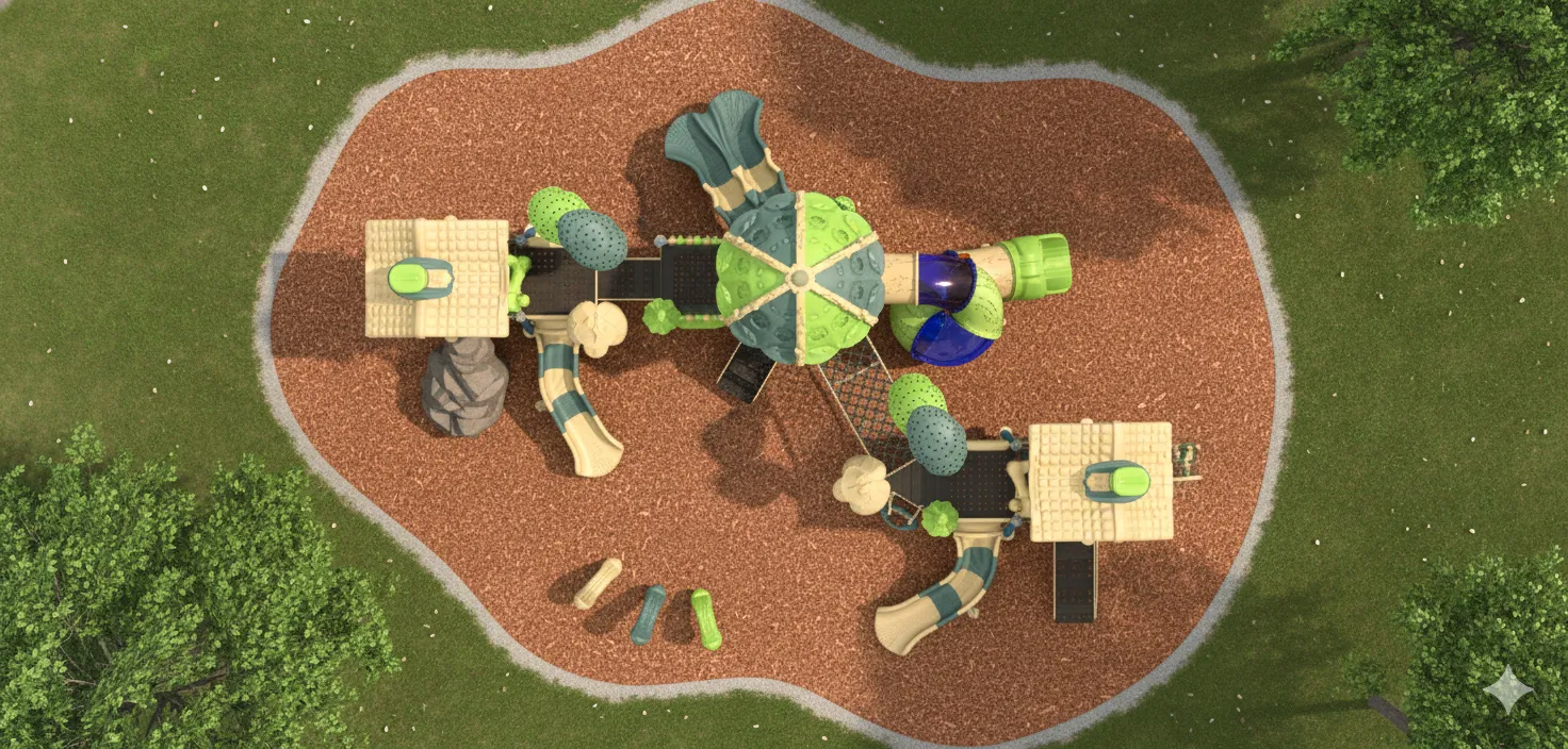 Ce module de jeu est un ensemble de structures aux formes décalées et aux angles volontairement inclinés, créant un environnement ludique qui défie la perception et l’équilibre des enfants. L’expérience commence par des échelles et des modules d’escalade pour monter vers la “maison tordue”, donnant l’impression de se trouver dans un monde de dessin animé. Les défis d’équilibre sont omniprésents : points, poutres et passerelles. Pour redescendre de ce village excentrique, des glissades offrent une descente rapide et amusante.