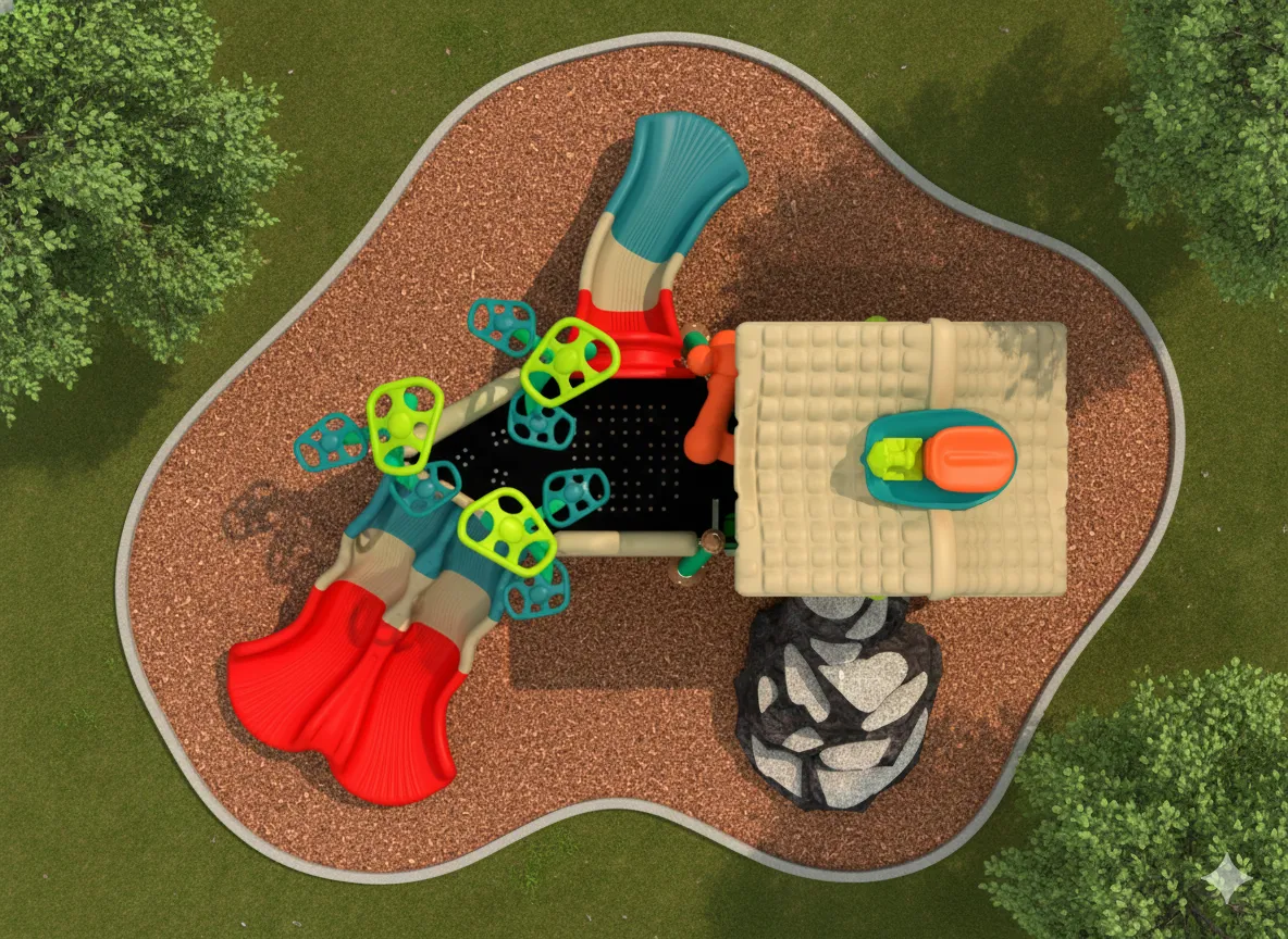 Ce module de jeu est un ensemble de structures aux formes décalées et aux angles volontairement inclinés, créant un environnement ludique qui défie la perception et l’équilibre des enfants. L’expérience commence par des échelles et des modules d’escalade pour monter vers la “maison tordue”, donnant l’impression de se trouver dans un monde de dessin animé. Les défis d’équilibre sont omniprésents : points, poutres et passerelles. Pour redescendre de ce village excentrique, des glissades offrent une descente rapide et amusante.