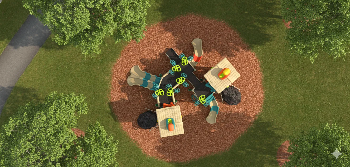 Ce module de jeu est un ensemble de structures aux formes décalées et aux angles volontairement inclinés, créant un environnement ludique qui défie la perception et l’équilibre des enfants. L’expérience commence par des échelles et des modules d’escalade pour monter vers la “maison tordue”, donnant l’impression de se trouver dans un monde de dessin animé. Les défis d’équilibre sont omniprésents : points, poutres et passerelles. Pour redescendre de ce village excentrique, des glissades offrent une descente rapide et amusante.