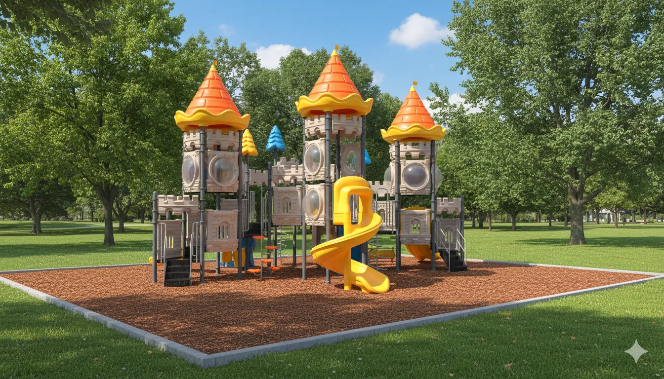 Ce module de jeu extérieur est une structure majestueuse inspirée d’un château médiéval, conçue pour stimuler l’imagination, l’activité physique et la dextérité motrice des enfants.