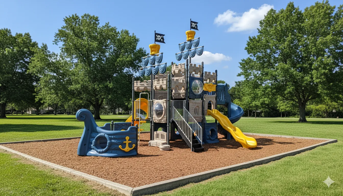Bateau Pirate : Structure de jeu extérieur spectaculaire, parfaite pour les aventures et la chasse au trésor. Développe l’agilité avec ses échelles, glissades et défis d’équilibre de flibustier. (accessoires au sol vendu séparément)