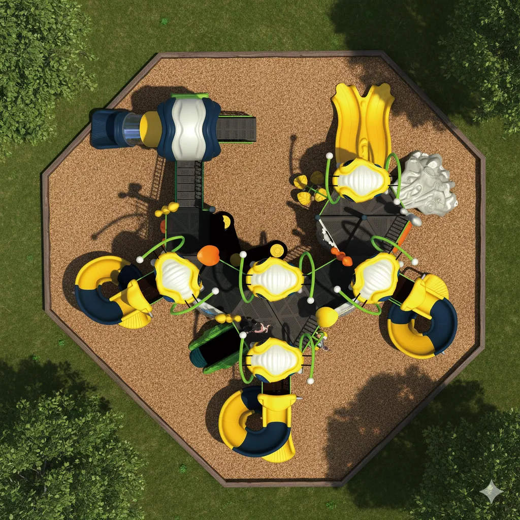 Ce module de jeu extérieur rappelant l’espace infini propulse les enfants dans un voyage intergalactique. Le décollage s’effectue en escaladant la structure principale, souvent en grâce à des échelles verticales, des murs d’escalade ou des filets, pour simuler la gravité zéro. Les jeunes astronautes explorent ensuite les défis d’équilibre, comme des passerelles suspendues ou des points-tunnels. Le retour sur Terre est l’occasion d’une descente vertigineuse par une glissade qui simule la rentrée atmosphérique. (accessoires au sol vendu séparément)