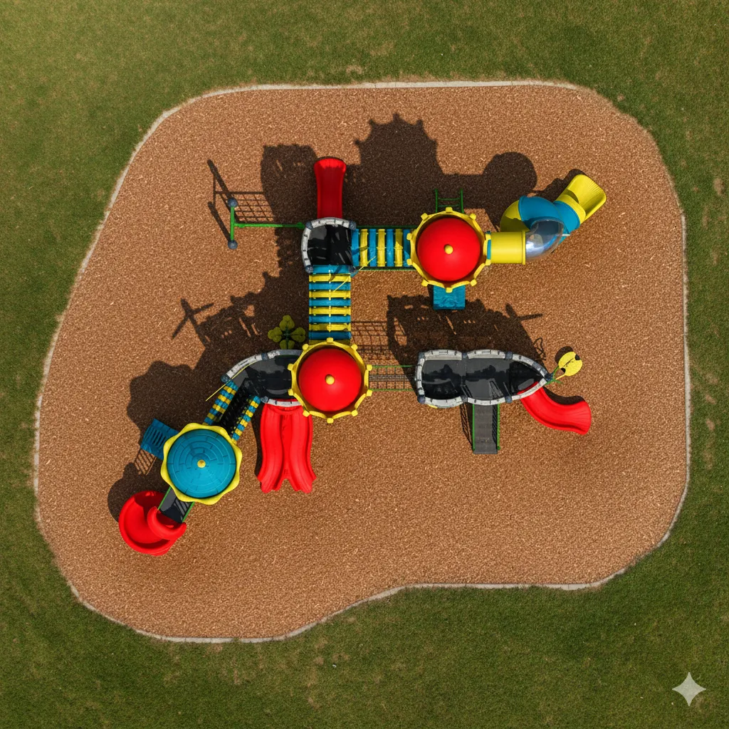 Il offre un parcours complet pour les jeunes aventuriers, combinant des défis d’escalade, de glisse et d’équilibre, en faisant un outil d’excellence pour le développement physique et social des enfants