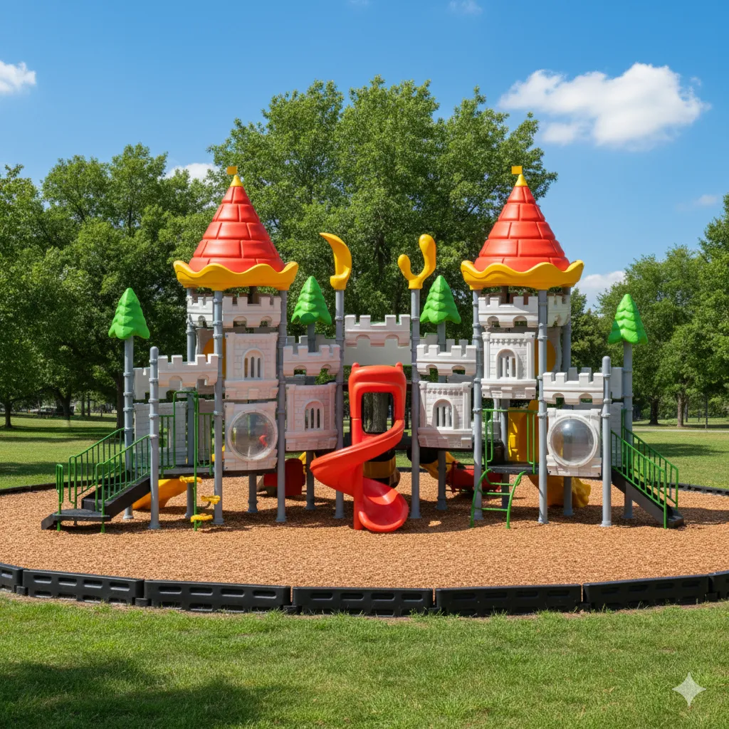 Ce module de jeu extérieur est une structure majestueuse inspirée d’un château médiéval, conçue pour stimuler l’imagination, l’activité physique et la dextérité motrice des enfants.