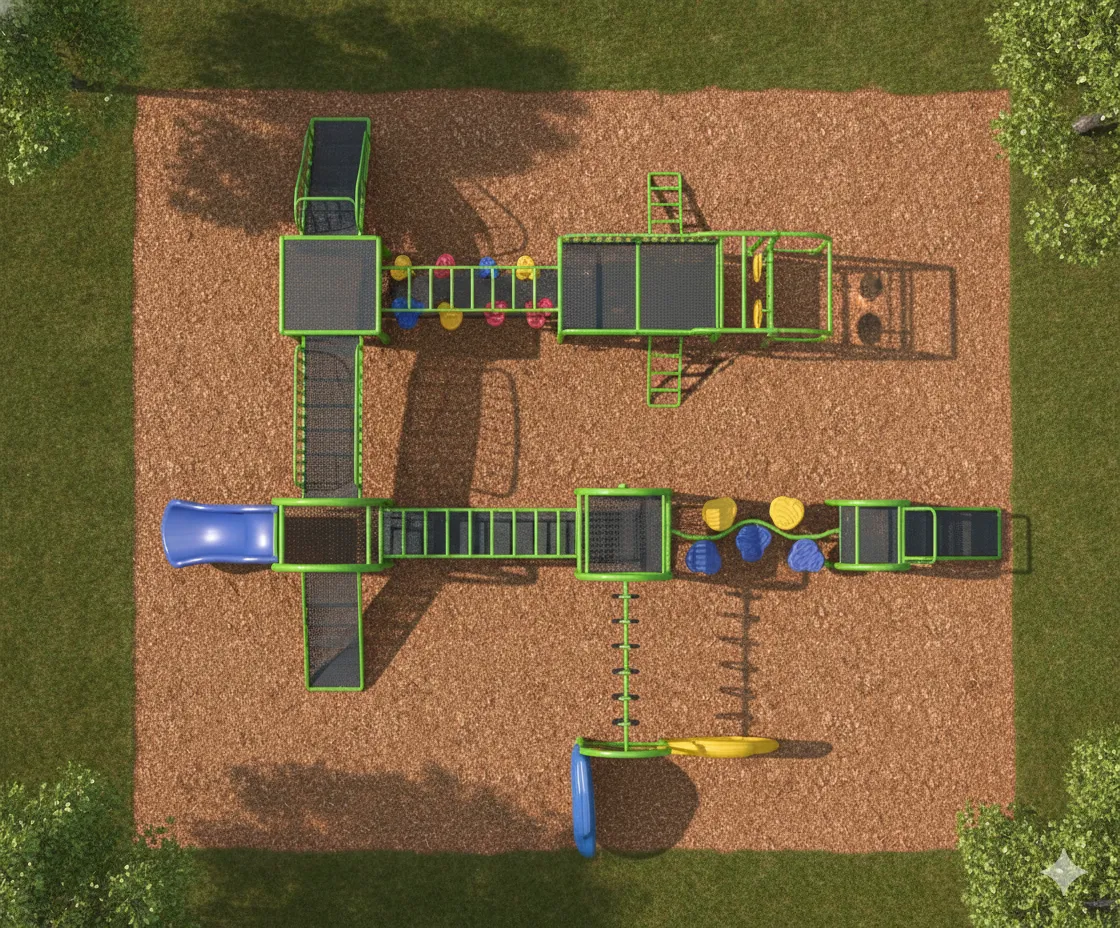 Parcours d’Agilité et d’Escalade : Structure ouverte et variée (cordes, filets) conçue pour se surpasser. L’ascension est centrale, complétée par des défis d’équilibre et des glissades rapides. Met l’accent sur la force, la motricité et la résolution de problèmes. (accessoires au sol vendu séparément)