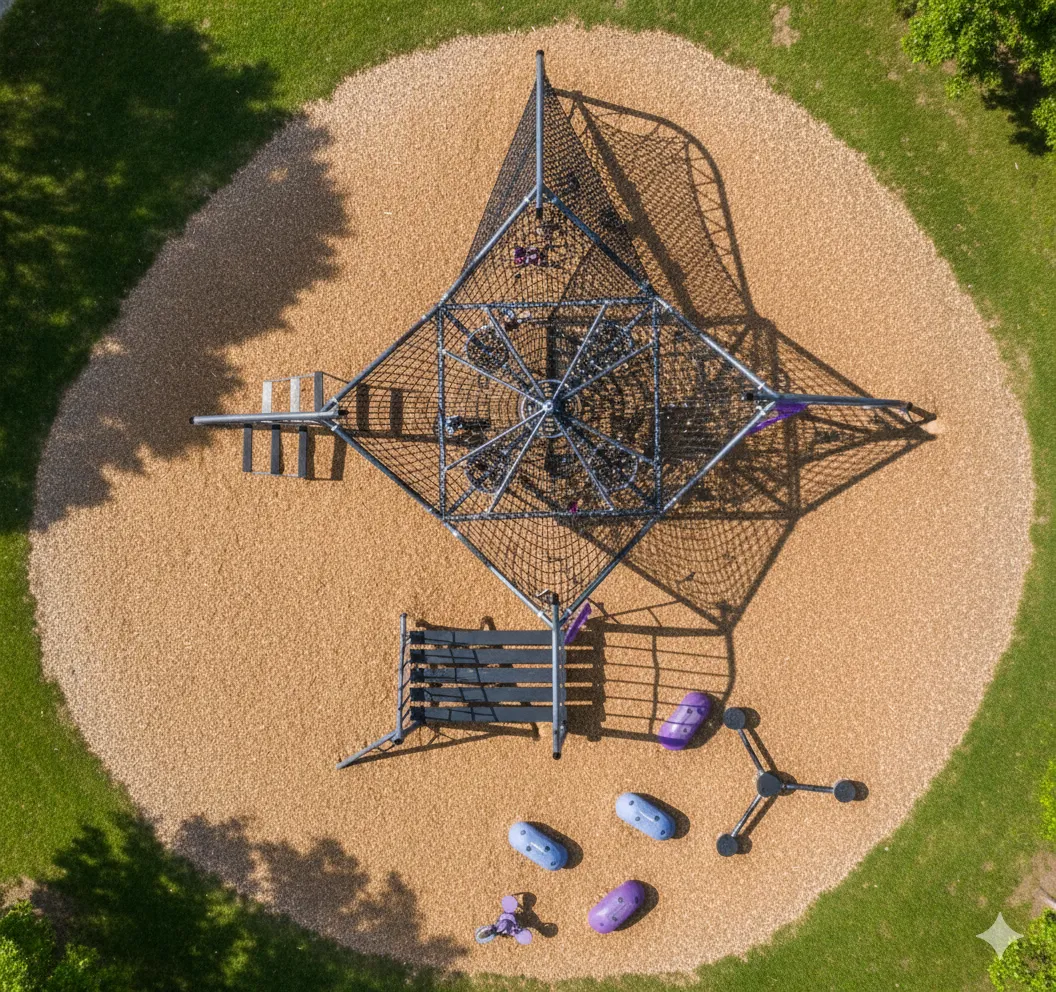 Parcours d’Agilité et d’Escalade : Structure ouverte et variée (cordes, filets) conçue pour se surpasser. L’ascension est centrale, complétée par des défis d’équilibre et des glissades rapides. Met l’accent sur la force, la motricité et la résolution de problèmes. (accessoires au sol vendu séparément)