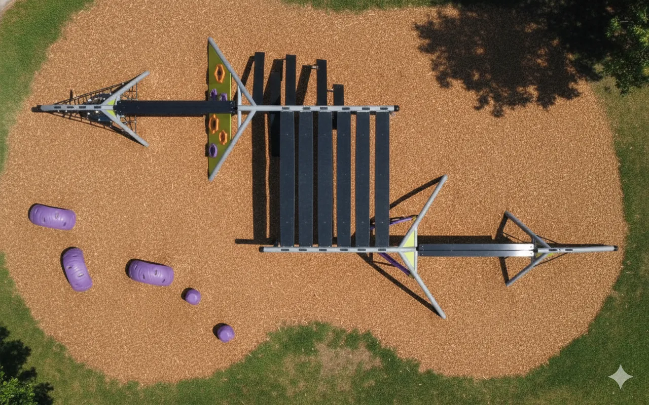 Parcours d’Agilité et d’Escalade : Structure ouverte et variée (cordes, filets) conçue pour se surpasser. L’ascension est centrale, complétée par des défis d’équilibre et des glissades rapides. Met l’accent sur la force, la motricité et la résolution de problèmes. (accessoires au sol vendu séparément)