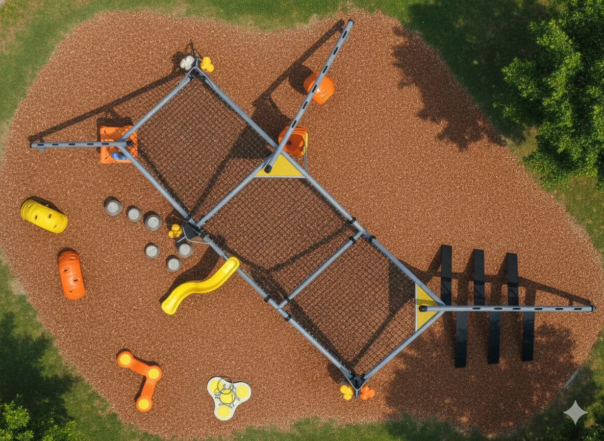 Parcours d’Agilité et d’Escalade : Structure ouverte et variée (cordes, filets) conçue pour se surpasser. L’ascension est centrale, complétée par des défis d’équilibre et des glissades rapides. Met l’accent sur la force, la motricité et la résolution de problèmes. (accessoires au sol vendu séparément)