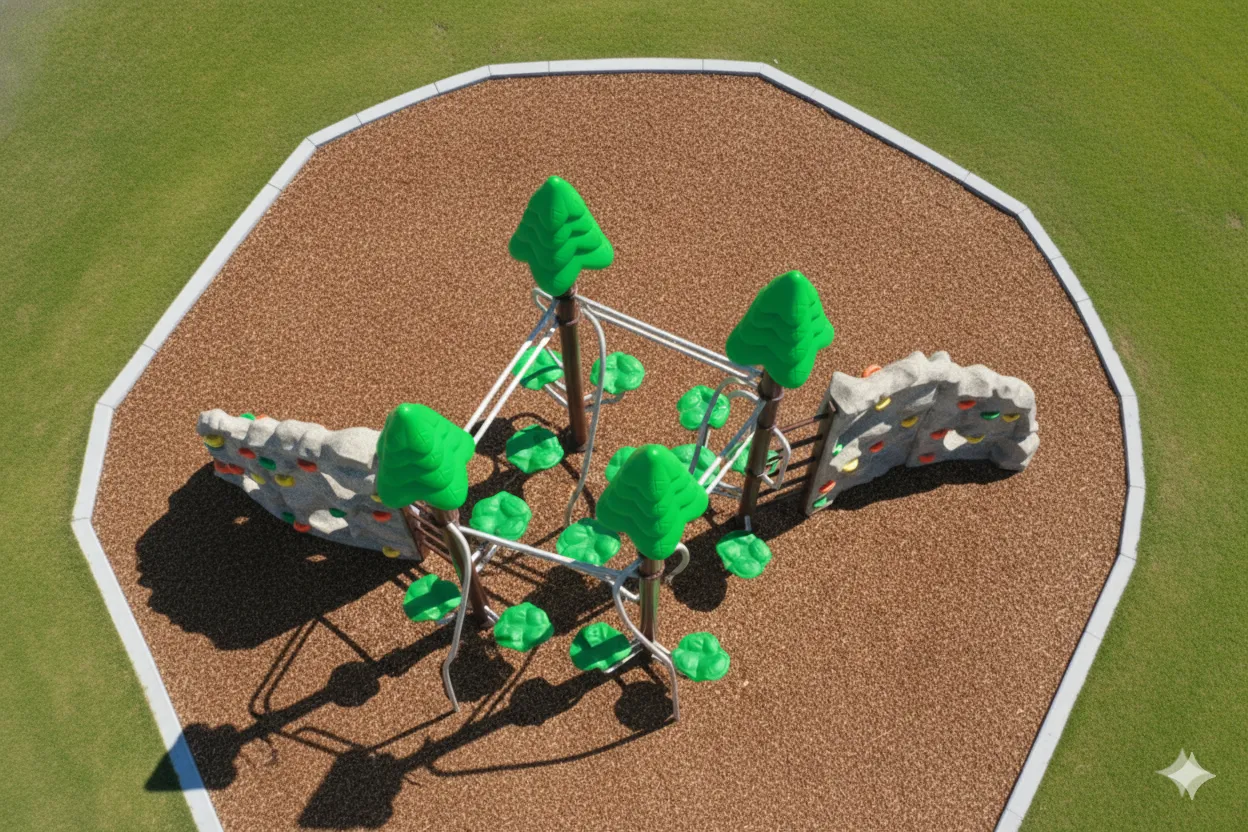 Parcours d’Agilité et d’Escalade : Structure ouverte et variée (cordes, filets) conçue pour se surpasser. L’ascension est centrale, complétée par des défis d’équilibre et des glissades rapides. Met l’accent sur la force, la motricité et la résolution de problèmes. (accessoires au sol vendu séparément)